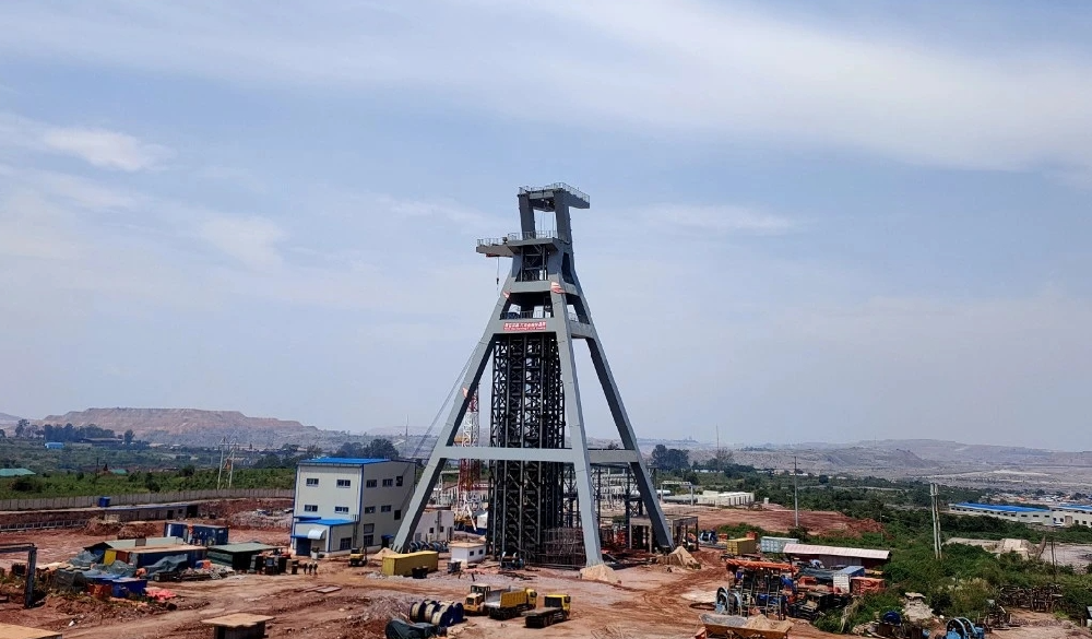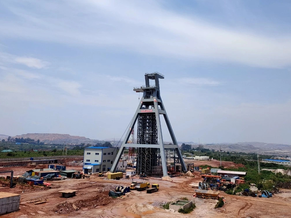 由金科項目公司承建的穆松尼銅礦混合井超大型井架主副斜架成功起立?;旌暇芸偢叨?9m,自重約2000噸,主副斜架重約1300噸,是金科項目首個超大型鋼結(jié)構(gòu)井架